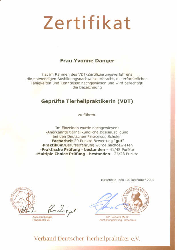 - 24. September 2007 - Abgabe der Facharbeit zur Verbandsgeprüften Tierheilpraktikerin. Thema: "Chronische Bronchitis beim Pferd". Sie kann hier als PDF angesehen werden.